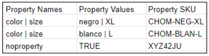 - Property Values: Propiedad de la variante del producto. Si el producto no tiene variantes se debe poner “true”.