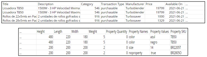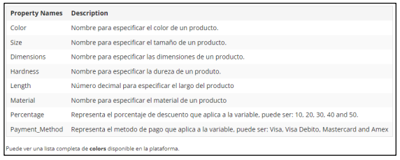 - Property Names: Nombre de la variante del producto, por ejemplo: color o size. Si se desea agregar más de una variante se deben separar por |. Si el producto no tiene variantes se debe poner “noproperty”. Las variantes se pueden ver en la pestaña de “Importar productos” de shopadmin.