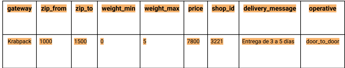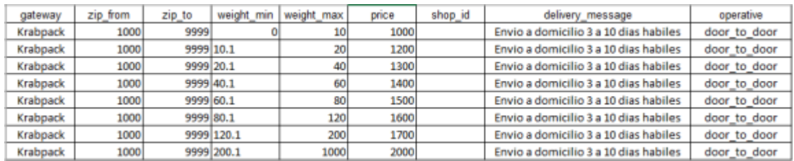 ● weight_min: Peso inicial del rango, en la primera fila siempre es 0. Los decimales se separan con puntos.