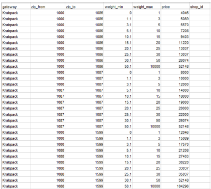 Esta matriz de ejemplo utiliza el rango de códigos postales del 1000 al 9999 y los costos de envío se determinan únicamente por el peso del producto.