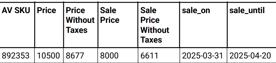 En caso de tener productos con oferta, se tiene que armar otro archivo con estos productos y agregar las siguientes columnas entre “Avalible On” y “Height”:
