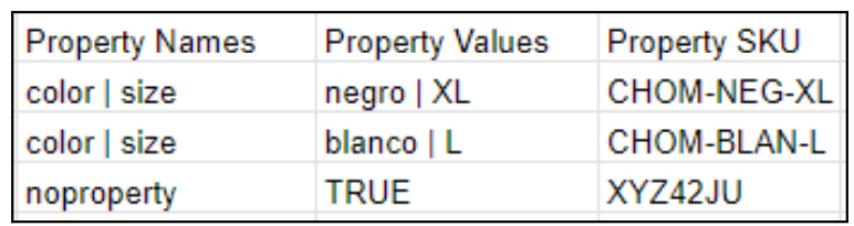 Nombre de la variante del producto, por ejemplo: color o size. Si se desea agregar más de una variante se deben separar por |. Si el producto no tiene variantes se debe poner “noproperty”. Las variantes se pueden ver en la pestaña de “Importar productos” de shopadmin.